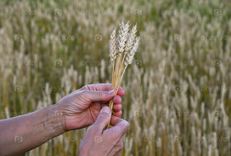 Колоски пшеницы или ржи в руках фермера. Руки пожилой женщины держат золотые колосья пшеничных колосков. Селективный фокус на колосках