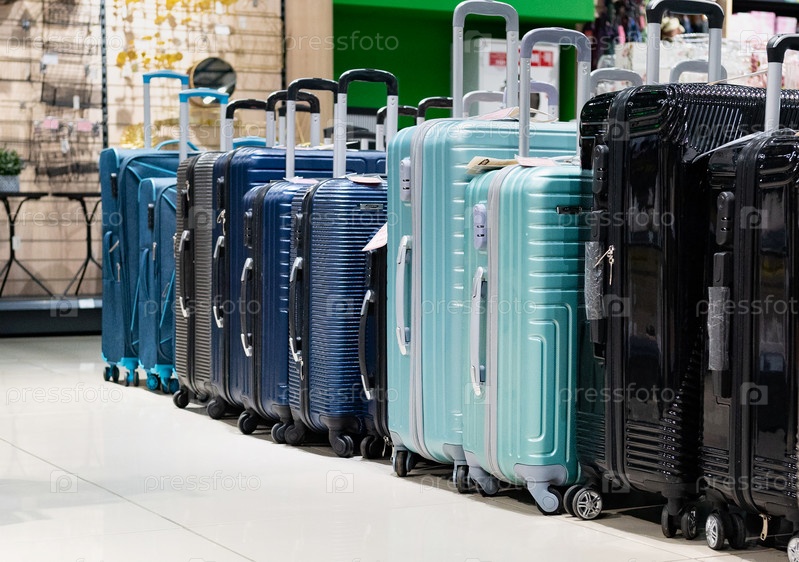 Покупатель выбирает чемодан для багажа в универмаге. Покупка небольшого багажа для деловой поездки. Туризм