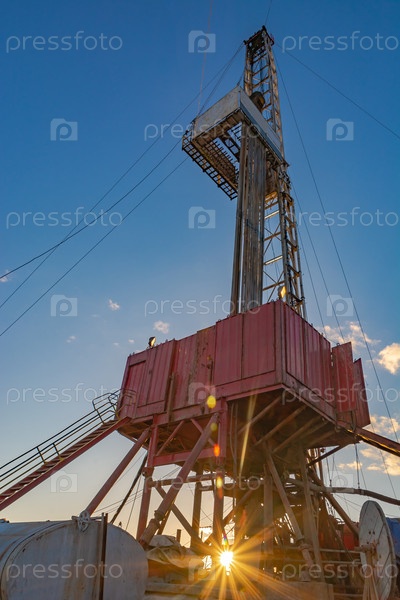 Буровая установка для глубокого бурения нефти и газа с солнечным лучом у основания. Образ бурлящей энергии недр. Многие бурильные трубы установлены вертикально