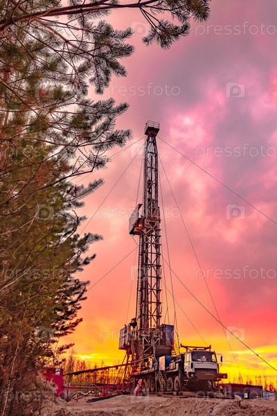 Бурение глубокой скважины мобильной буровой установкой на месторождении нефти и газа. Месторождение расположено на Крайнем Севере в тайге. Красивое драматическое закатное небо на заднем плане