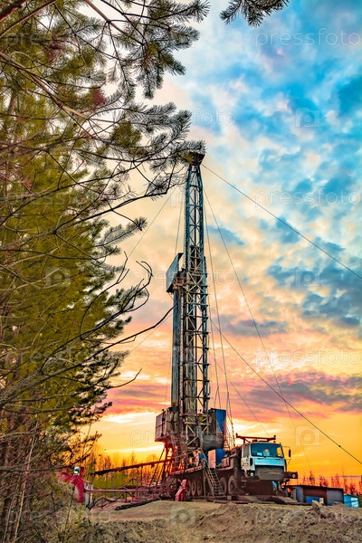 Бурение глубокой скважины мобильной буровой установкой на месторождении нефти и газа. Месторождение расположено на Крайнем Севере в тайге. Красивое драматическое закатное небо на заднем плане