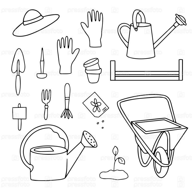 Набор иконок для садоводства ручной работы. Весеннее или летнее оборудование для работы на открытом воздухе. Коллекция элементов эскиза: лейки, шляпа, лопата, вилка, грабли, тачка, перчатки, семена и многое другое. Векторная иллюстрация