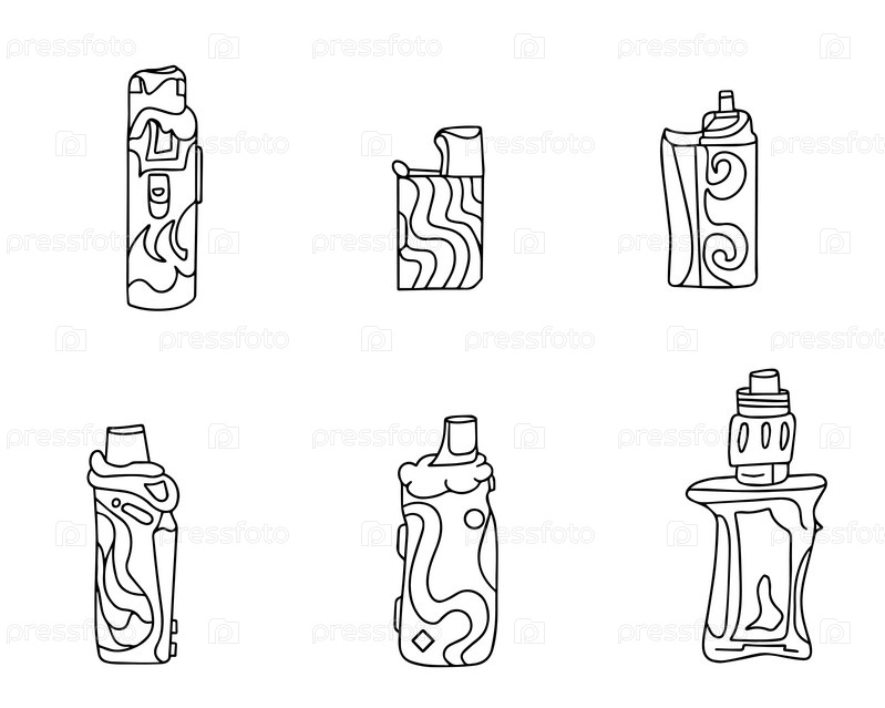 Набор электронных сигарет с рисунками, изолированными на белом фоне. Современная иллюстрация курения, вейпинга и никотина. Бросьте курить и вейпинг. Векторная иллюстрация
