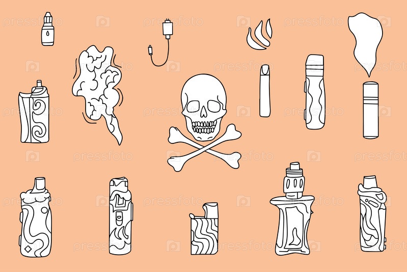 Набор одноразовых электронных сигарет, эскизов курения и вейпинга. Сигареты и вейпы в стиле каракулей. Векторная иллюстрация