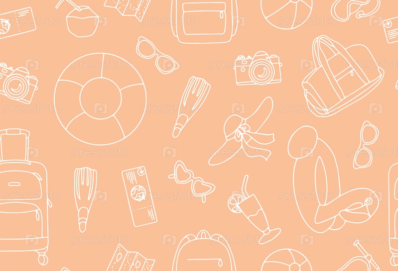 Бесшовный рисунок элементов летнего отдыха, багажа и купальников. Элемент путешествия, нарисованный в стиле каракулей
