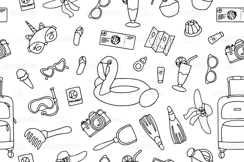 Бесшовный рисунок элементов летнего отдыха, багажа и купальников. Элемент путешествия, нарисованный в стиле каракулей