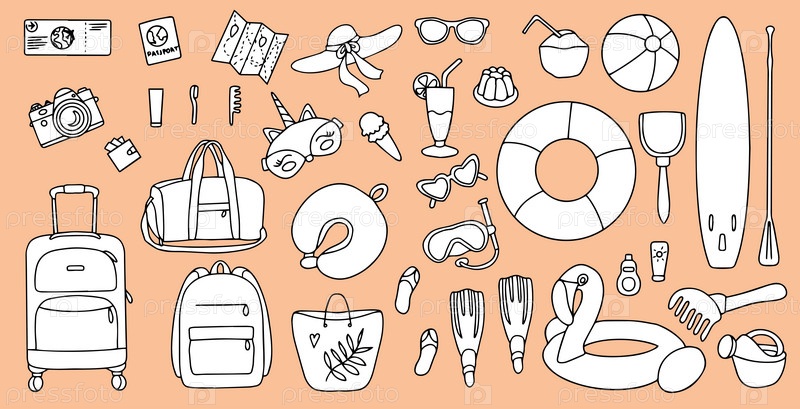 Ручной набор элементов летнего отдыха, багажа, купальников и пляжных аксессуаров. Элемент путешествия, нарисованный в стиле каракулей. Иллюстрация для баннера, фона, значка, дизайна логотипа. Вектор
