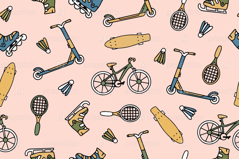 Бесшовный рисунок со спортивным инвентарем. Красочный спортивный инвентарь ручной работы. Узор на тему спорта, здорового образа жизни. Фон для использования в дизайне, упаковке, веб-сайте, ткани. Вектор