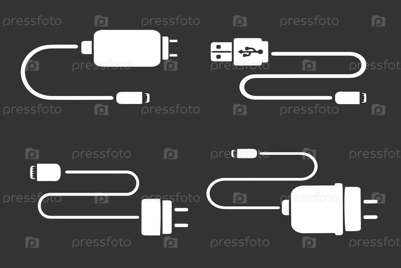 Набор значков зарядного устройства для телефона и планшета. Автомобильные адаптеры для зарядки устройств. Шнуры питания. Векторное цифровое оборудование для заправки аккумуляторов