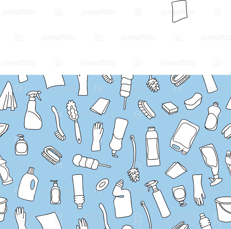 Бесшовный рисунок чистящего оборудования. Иконки линий очистки. Линия чистящих, моющих и дезинфицирующих средств ручной работы. Векторная иллюстрация