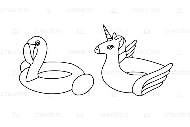 Набор векторных иллюстраций игрушек. Надувные кольца для плавания с фламинго и единорогом. Летние каникулы, путешествия по океанскому пляжу
