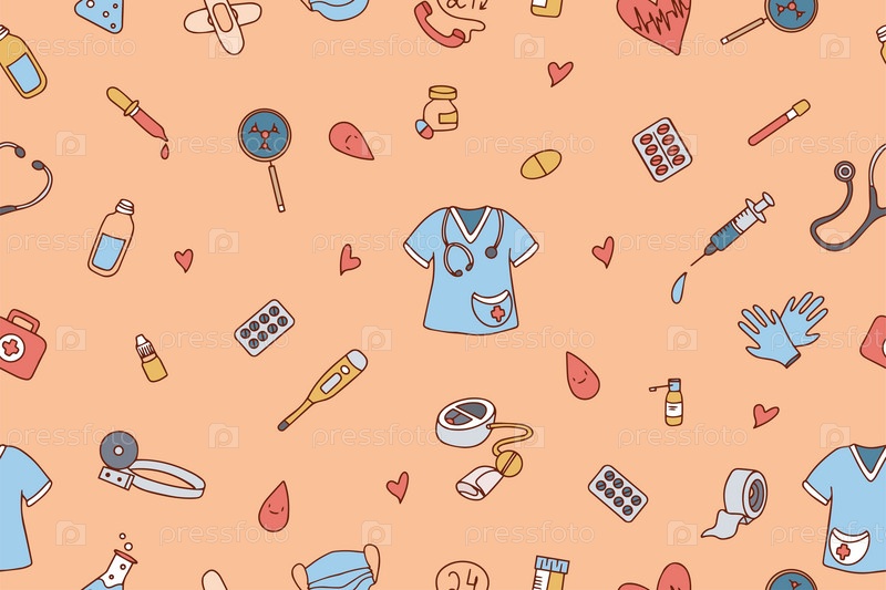 Бесшовный рисунок с лекарствами, диагностическими и лечебными предметами. Векторная ручная иллюстрация в стиле каракулей. Векторная иллюстрация