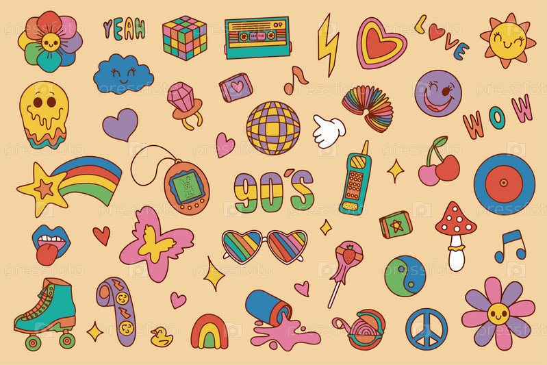 Классические элементы 80-х 90-х годов в современном плоском стиле. Ручная рисованная векторная иллюстрация. Модная нашивка, значок, эмблема. Векторная иллюстрация. Векторная иллюстрация