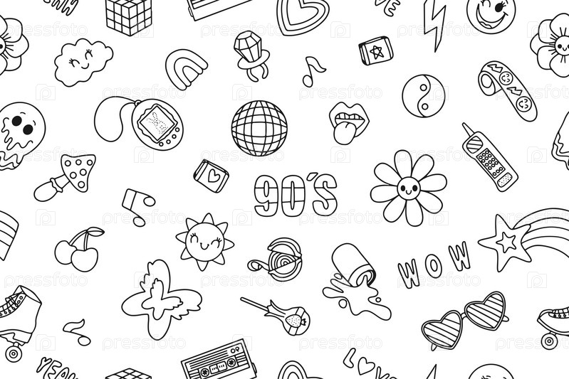 Бесшовный узор из классических элементов 80-х 90-х годов в стиле каракулей. Ручная рисованная векторная иллюстрация. Модная нашивка, значок, эмблема. Векторная иллюстрация. Вектор