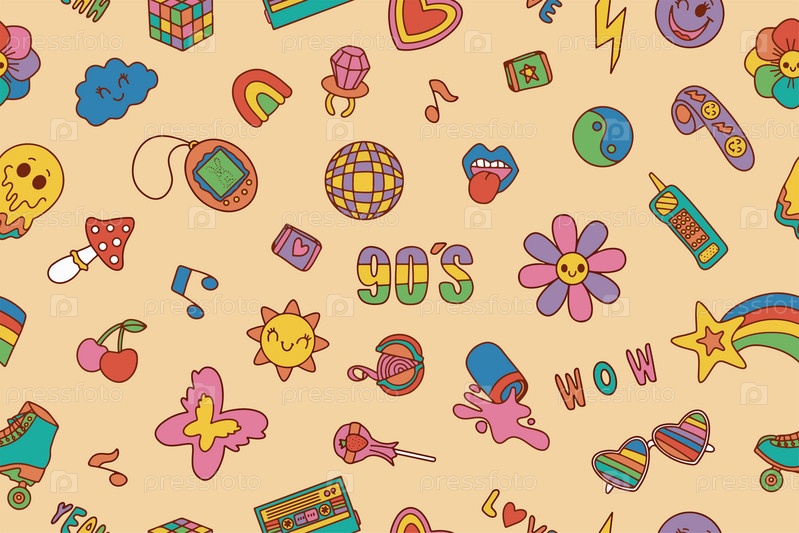 Бесшовный узор из классических элементов 80-х 90-х годов в стиле каракулей. Ручная рисованная векторная иллюстрация. Модная нашивка, значок, эмблема. Векторная иллюстрация. Вектор
