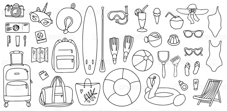 Ручной набор элементов летнего отдыха, багажа, купальников и пляжных аксессуаров. Элемент путешествия, нарисованный в стиле каракулей. Иллюстрация для баннера, фона, значка, дизайна логотипа. Вектор
