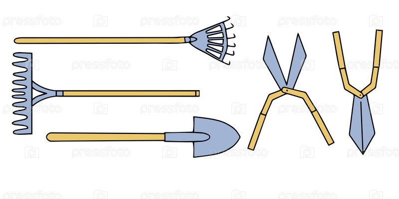 Садовые инструменты линейные иконки и каракули. Садовые грабли, садовые вилки, секаторы, секаторы, штыковая лопата. Линия искусства изолирована на белом. Векторная иллюстрация