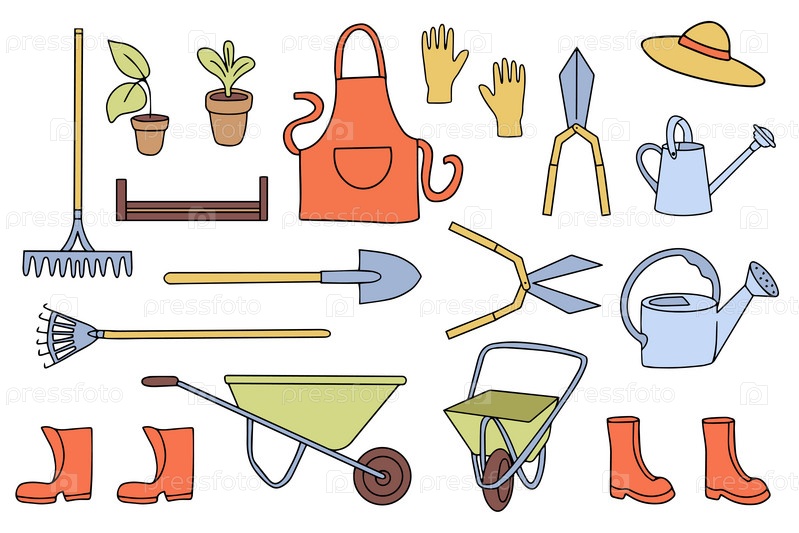 Большой набор садовых инструментов в стиле каракулей. Лейка, мотыга, ведро, шланг, вилы, лопата, тачка, мастерок, секаторы, саженцы деревьев, садовые вилы, грабли и другие линейные значки