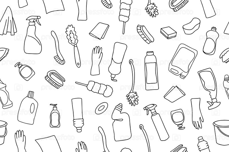 Бесшовный рисунок чистящего оборудования. Иконки линий очистки. Линия рисованного оборудования, чистящих средств и инструментов для мытья и дезинфекции дома, ведра и швабры, распылителя моющих средств. Вектор