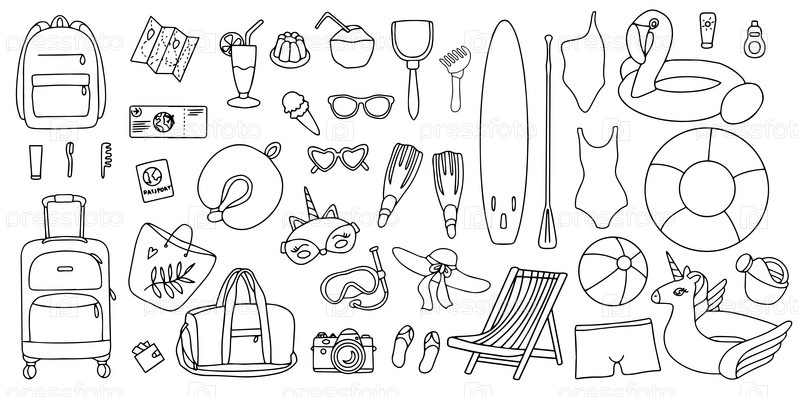 Ручной набор элементов летнего отдыха, багажа, купальников и пляжных аксессуаров. Элемент путешествия, нарисованный в стиле каракулей. Иллюстрация для баннера, фона, значка, дизайна логотипа. Вектор