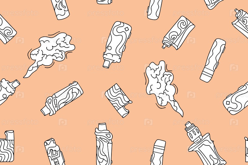 Бесшовный рисунок с жидкостью для вейпа. Векторная иллюстрация. Стиль каракулей. Печать с помощью электронных сигарет. Векторная иллюстрация