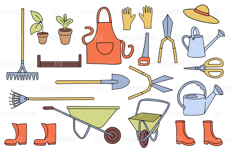 Большой набор садовых инструментов в стиле каракулей. Лейка, мотыга, ведро, шланг, вилы, лопата, тачка, мастерок, секаторы, саженцы деревьев, садовые вилы, грабли и другие линейные значки