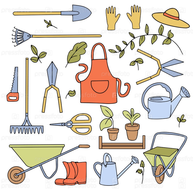 Большой набор садовых инструментов в стиле каракулей. Лейка, мотыга, ведро, шланг, вилы, лопата, тачка, мастерок, секаторы, саженцы деревьев, садовые вилы, грабли и другие линейные значки
