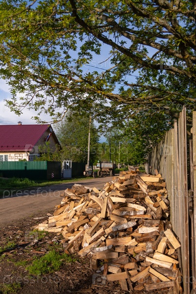 На улице возле дома под деревом аккуратно сложены дрова