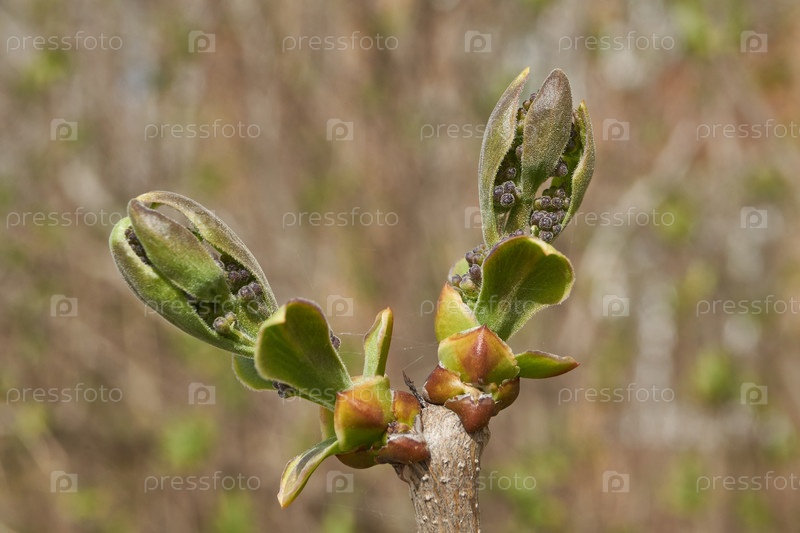 Цветочные соцветия появились из бутонов сирены (лат. Syringa vulgaris) в лучах весеннего солнца