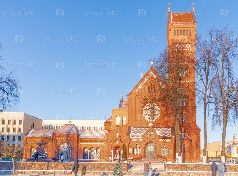 МИНСК, БЕЛАРУСЬ - 7 января 2024 года: Знаменитая католическая церковь Св. Симона и Елены или Красная церковь на площади Независимости. Достопримечательность Минска - столицы Беларуси