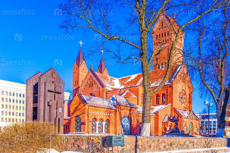 МИНСК, БЕЛАРУСЬ - 7 января 2024 года: Знаменитая католическая церковь Св. Симона и Елены или Красная церковь на площади Независимости. Достопримечательность Минска - столицы Беларуси