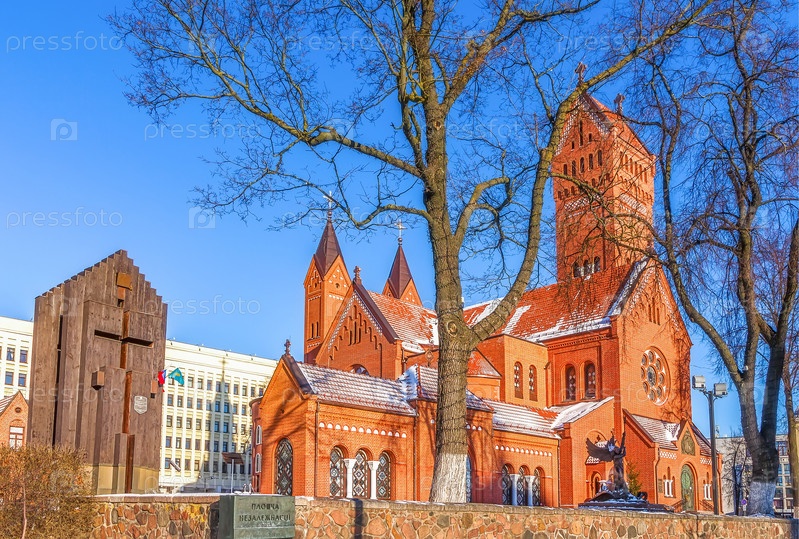 МИНСК, БЕЛАРУСЬ - 7 января 2024 года: Знаменитая католическая церковь Св. Симона и Елены или Красная церковь на площади Независимости. Достопримечательность Минска - столицы Беларуси