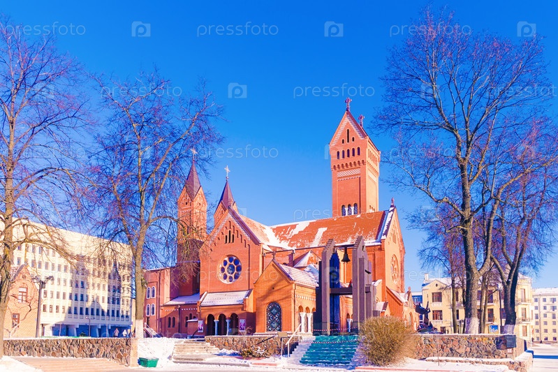 МИНСК, БЕЛАРУСЬ - 7 января 2024 года: Знаменитая католическая церковь Св. Симона и Елены или Красная церковь на площади Независимости. Достопримечательность Минска - столицы Беларуси