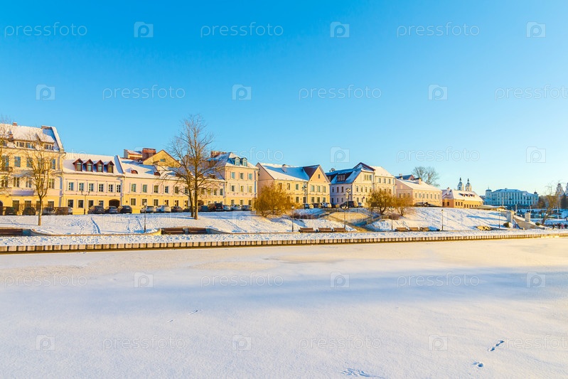 МИНСК, БЕЛАРУСЬ - 7 января 2024 года: Троицкое предместье Траецкое Прадмесце на реке Свислочь - исторический центр, старый город Минска. Достопримечательность столицы Беларуси Минска