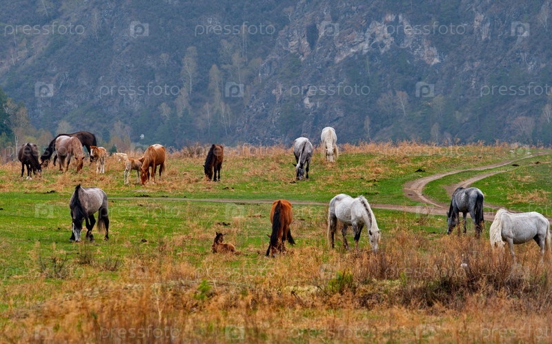Россия. Юг Западной Сибири, горный Алтай. Небольшое стадо лошадей мирно пасутся на весеннем пастбище на фоне заросших гор