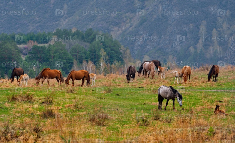 Россия. Юг Западной Сибири, горный Алтай. Небольшое стадо лошадей мирно пасутся на весеннем пастбище на фоне заросших гор
