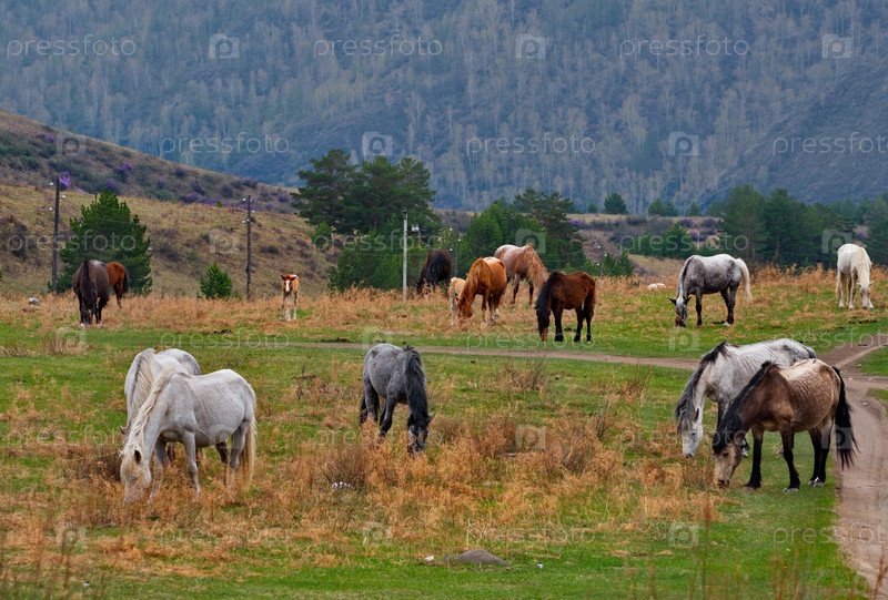 Россия. Юг Западной Сибири, горный Алтай. Небольшое стадо лошадей мирно пасутся на весеннем пастбище на фоне заросших гор