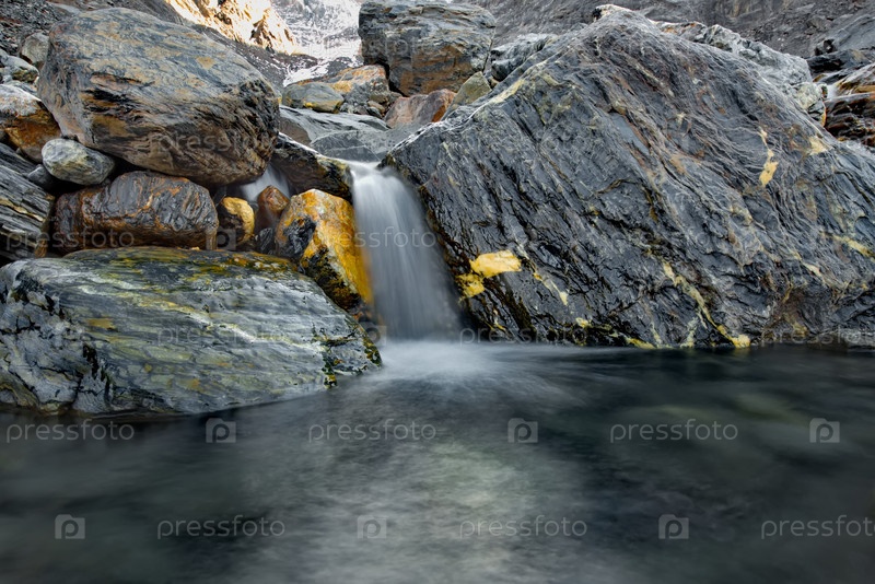 Россия, Горный Алтай. Небольшой водопад на реке Актру возле одноименного горного ледника снятый на длинной выдержке