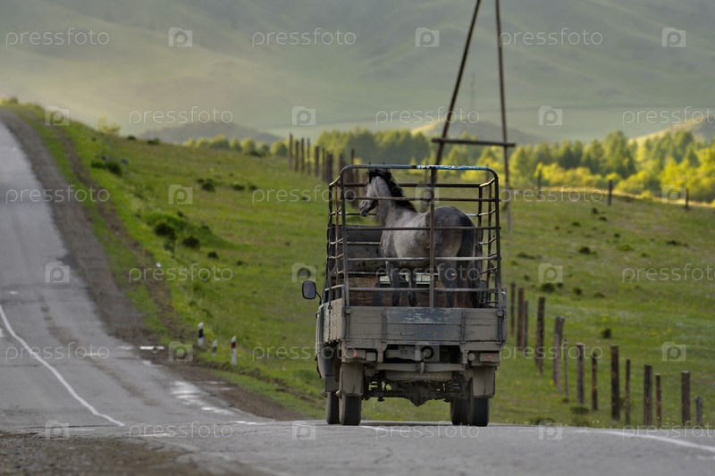 Россия, Горный Алтай. Породистого жеребца перевозят на специально оформленной грузовой машине по горной дороге возле поселка Усть-Кан