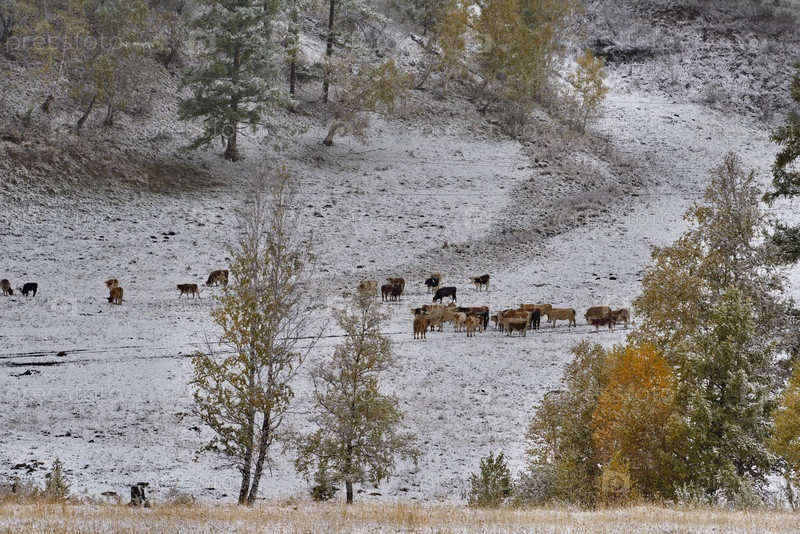 Россия, Горный Алтай. Первый осенний снег на горных пастбищах с пасущимся копытными