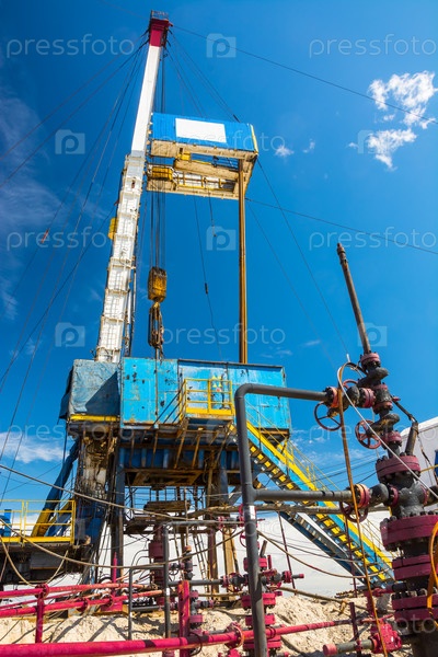 Мобильная буровая установка для бурения нефтяных и газовых скважин. На фоне голубого неба. Арматура для добычи нефти и газа расположена рядом с буровой