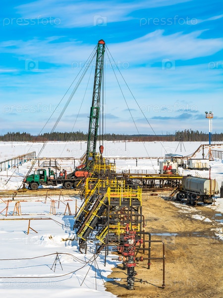Нефтяное месторождение в Сибири. В ряду расположены нефтедобывающие скважины. На заднем плане ведутся работы по капитальному ремонту скважины. Весна. На земле остатки снега