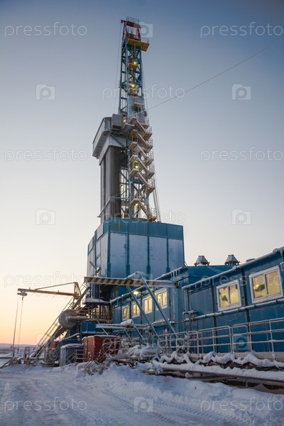 Бурение глубокой скважины с помощью буровой установки на месторождении нефти и газа. Месторождение расположено на Крайнем Севере за Полярным кругом. Съемки проводились зимой во время полярного дня