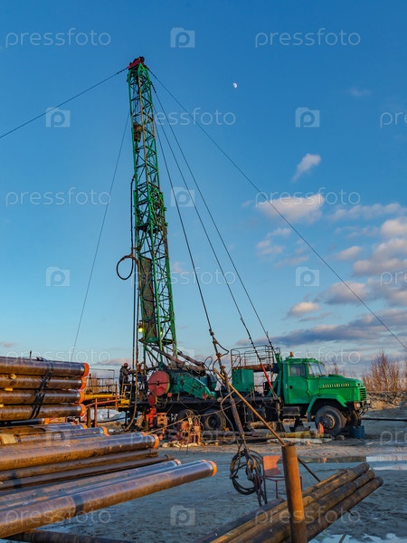 Мобильная установка для ремонта глубоких нефтяных скважин на месторождениях. На переднем плане хранятся буровые и обсадные трубы