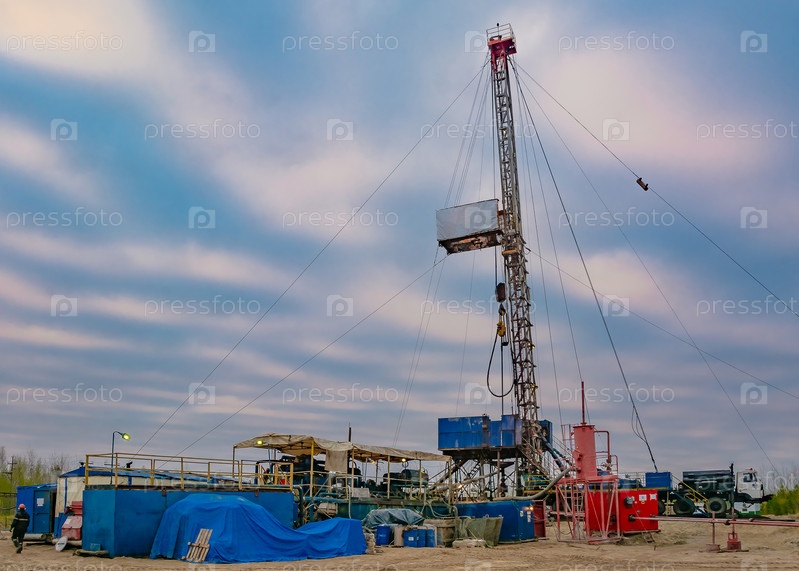 Бурение глубокой скважины мобильной буровой установкой на месторождении нефти и газа. Месторождение расположено на Крайнем Севере в тайге. Красивое драматическое закатное небо на заднем плане