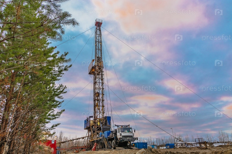 Бурение глубокой скважины мобильной буровой установкой на месторождении нефти и газа. Месторождение расположено на Крайнем Севере в тайге. Красивое драматическое закатное небо на заднем плане