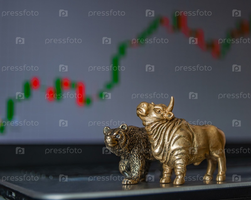 Бык и медведь как символы биржевой торговли на размытом фоне ценовой графики. Понятие символики товарных и финансовых мировых рынков