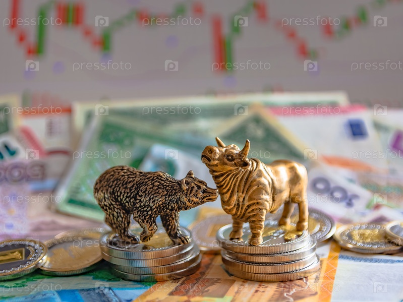 Бронзовые фигуры быка и медведя возле металлических монет на фоне бумажных денег и диаграмм. Размытие фона и перспективы. Концепция и символ фондовой биржи и торговли акциями