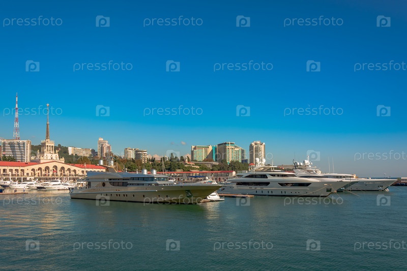 Морской порт летом. На пристани стоит множество разных яхт и катеров. Яхтсмены и путешественники готовятся к выходу в море. На фоне здания приморского города
