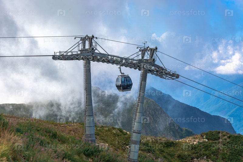 Экстремальная поездка на канатной дороге в горах. Зеленые склоны гор. Летний отдых